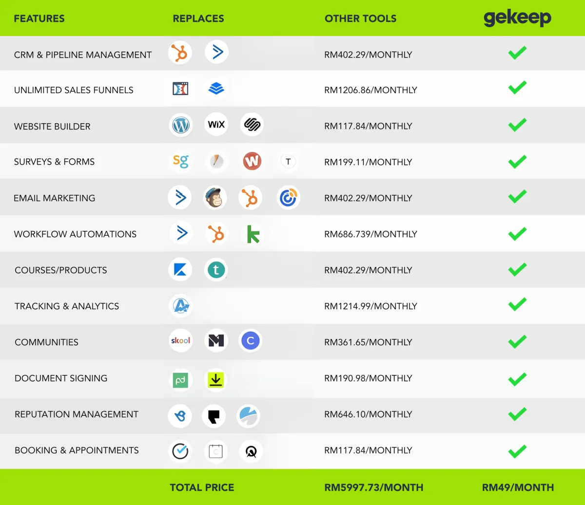 Chatbot, CRM, Funnel Builder, and all other functions in the features section above, other than the one listed in the Growth package.